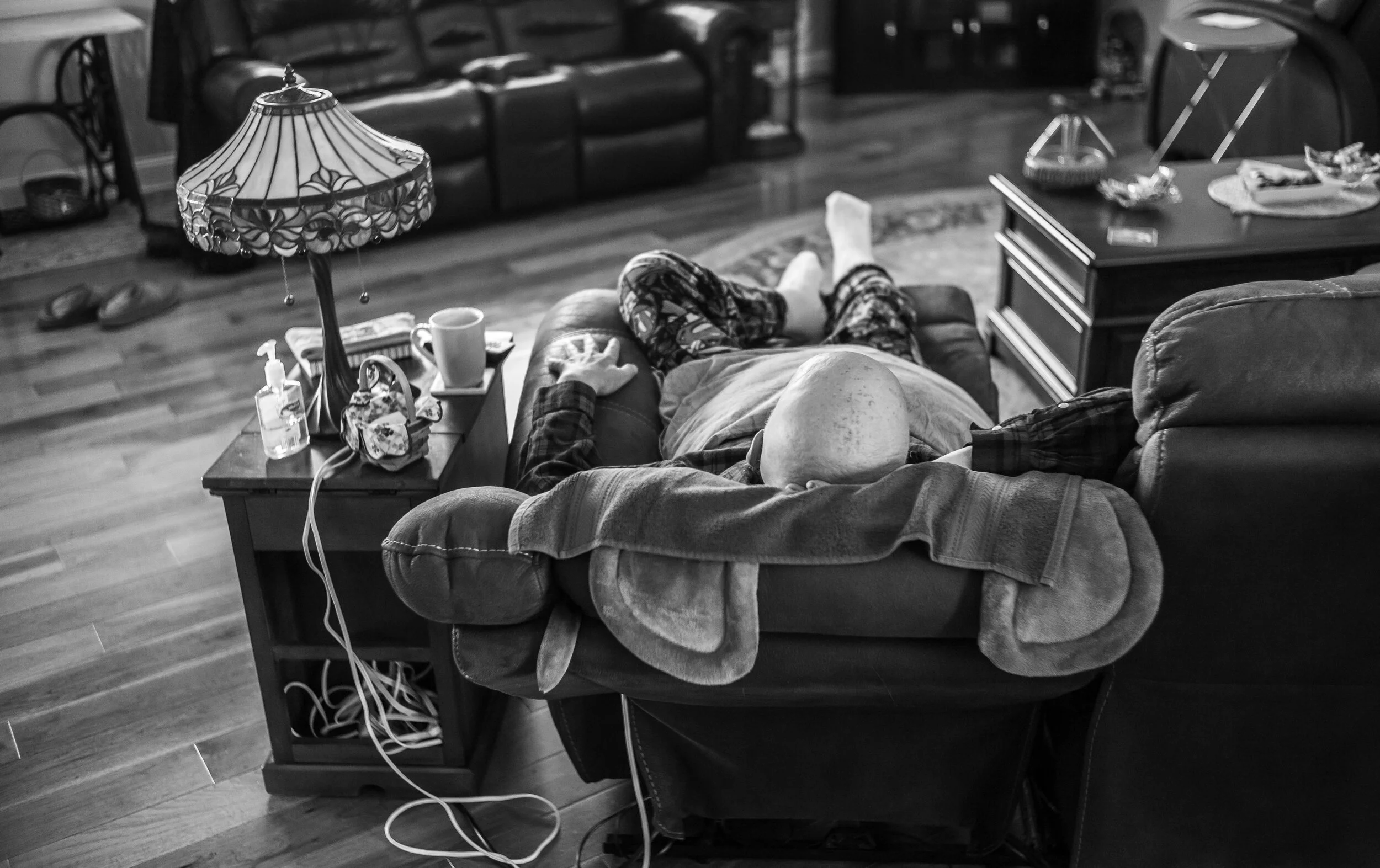 Early Sunday morning...checking in on Mom and Dad. I found Dad in his usual spot, reclined in front of the TV. He had hernia surgery last Wednesday and is a lot of pain. Not eating much. A pillow across his mid-section to keep the cats from jumping on him.