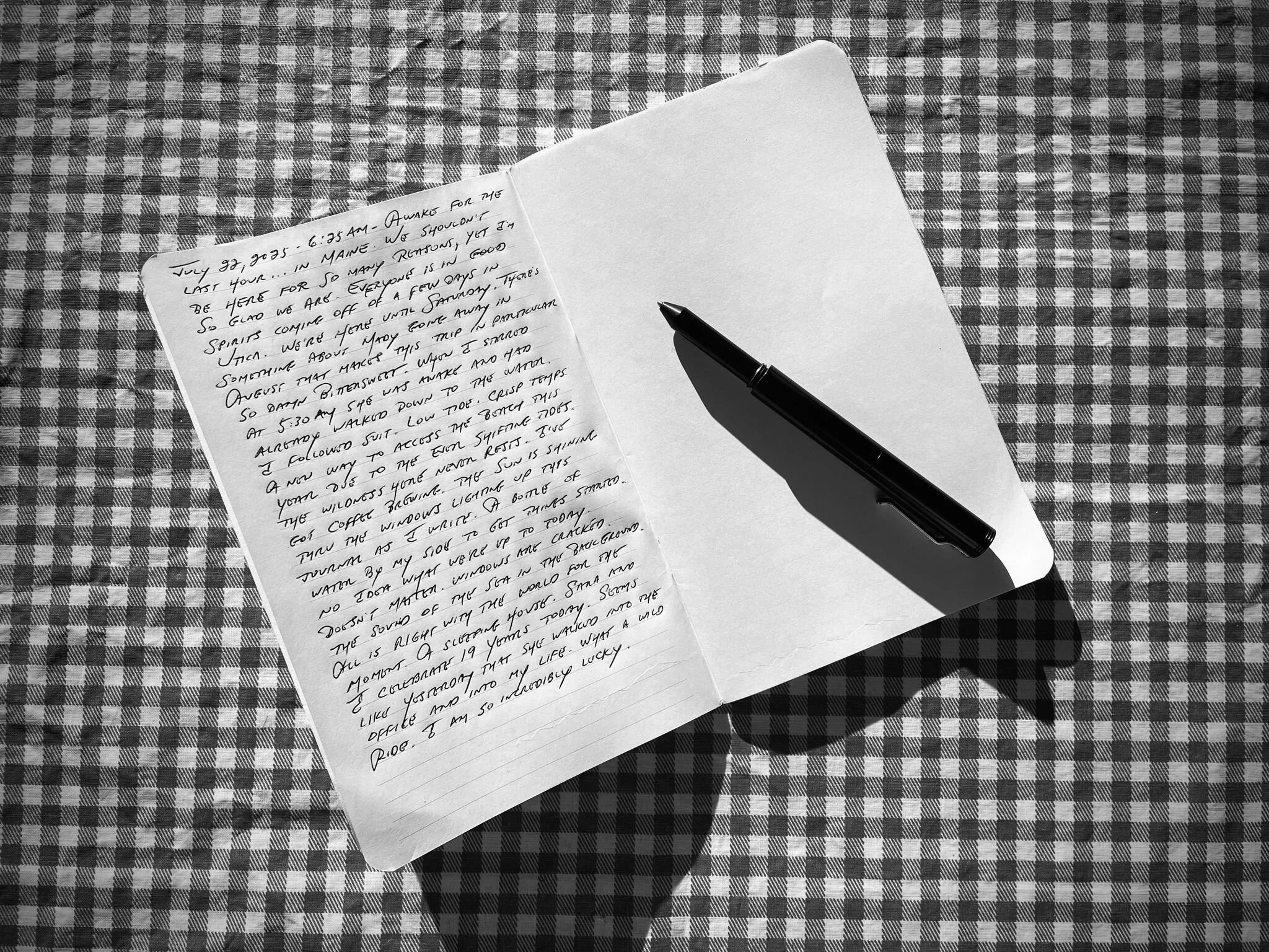 Awake for the last hour…in Maine. We shouldn’t be here for so many reasons, yet I’m so glad we are. Everyone is in good spirits coming off of a few days in Utica. We’re here until Saturday. There’s something about Mady going away in August that makes this trip in particular so damn bittersweet. When I stirred at 5:30AM she was awake and had already walked down to the water. I followed suit. Low tide. Crisp temps. A new way to access the beach this year due to the ever shifting tides. The wildness here never rests. I’ve got coffee brewing. The sun is shining thru the windows lighting up this journal as I write. A bottle of water by my side to get things started. No idea what we’re up to today. Doesn’t matter. Windows are cracked. The sound of the sea in the background. All is right with the world for the moment. A sleeping house. Sara and I celebrate 19 years today. Seems like yesterday that she walked into the office and into my life. What a wild ride. I am so incredibly lucky.